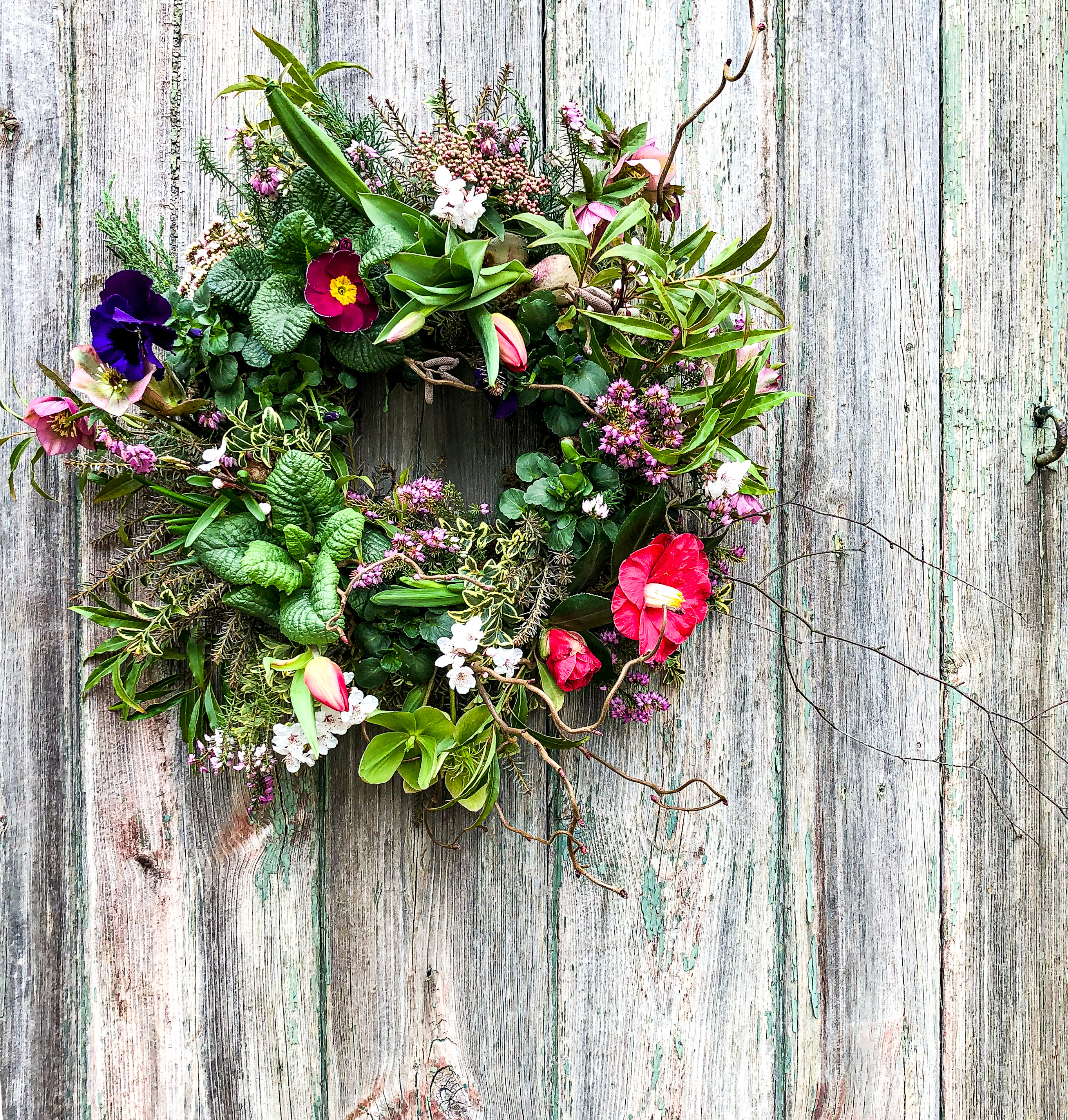 Using a light metal base, we will anchor moss, small plugs of spring plants and seasonal bulbs, crafting a living wreath designed to flourish and evolve through to early summer.